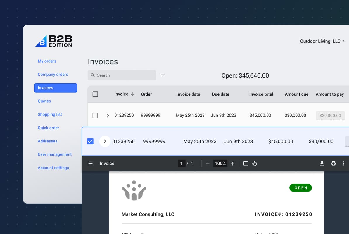 Descubre las herramientas más vanguardistas para las empresas B2B, como la gestión avanzada de cuentas, la gestión del crédito de las cuentas empresariales, las opciones de pago flexibles, la creación de presupuestos mediante IA y un amplio portal de representantes de ventas. Empieza con un portal de compradores preparado para su lanzamiento, listo para usar, o personalízalo más a través de nuestra arquitectura de código abierto.