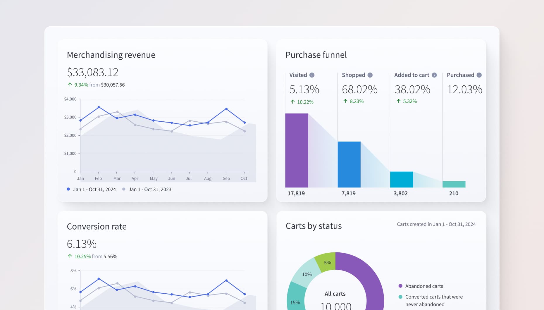 Con potentes herramientas de análisis integradas en cada plan, puede realizar un seguimiento de su negocio y realizar ajustes para acelerar su crecimiento. Además, nuestro creciente conjunto de herramientas de IA puede acelerar sus tareas diarias y reducir el esfuerzo de administrar su negocio.