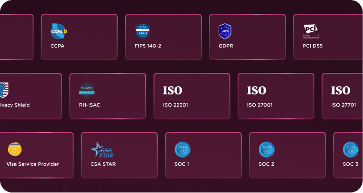 Brindamos seguridad y cumplimiento cruciales para marcas empresariales de todo el mundo con una lista creciente de compatible de Nivel 1 que incluyen ISO, SOC, PCI, FIPS, RH-ISAC, GDPR y CCPA.